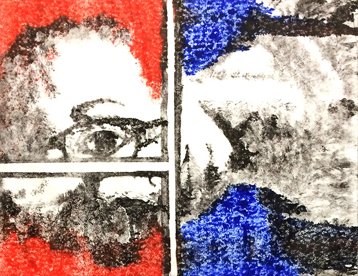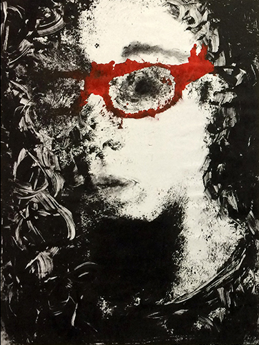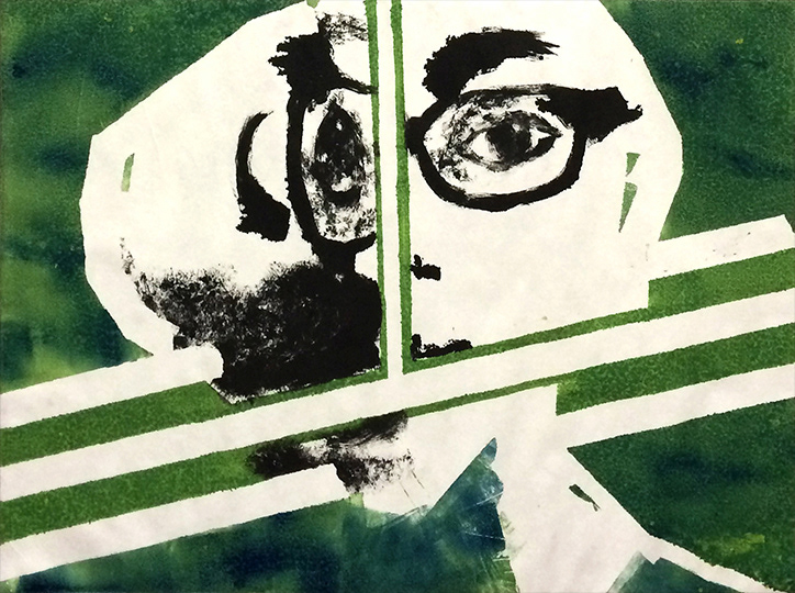 In this series of self portraits, each individual mono-print explores the use of a strong graphic line and composition juxtaposed to various textures and primary color relationships.