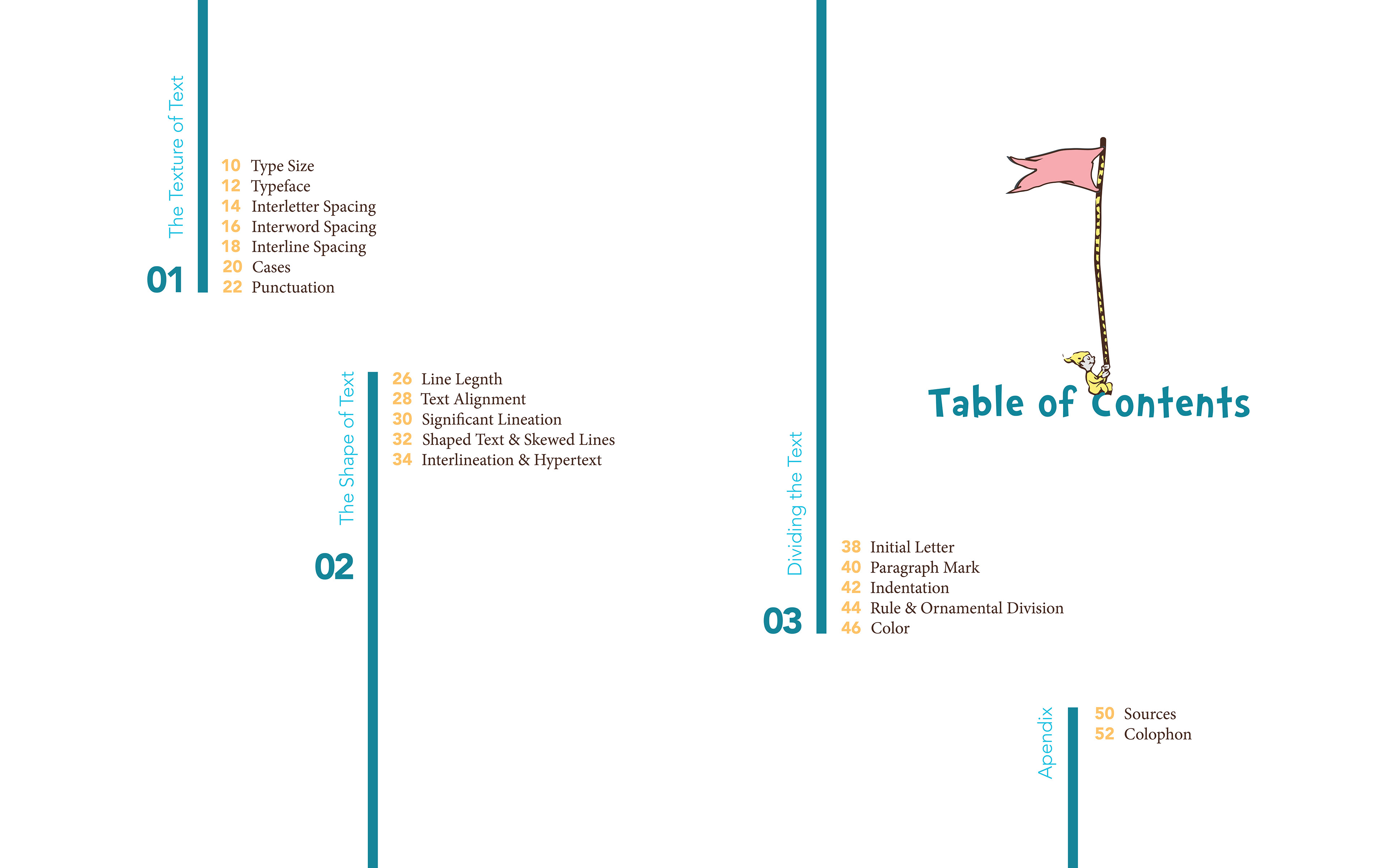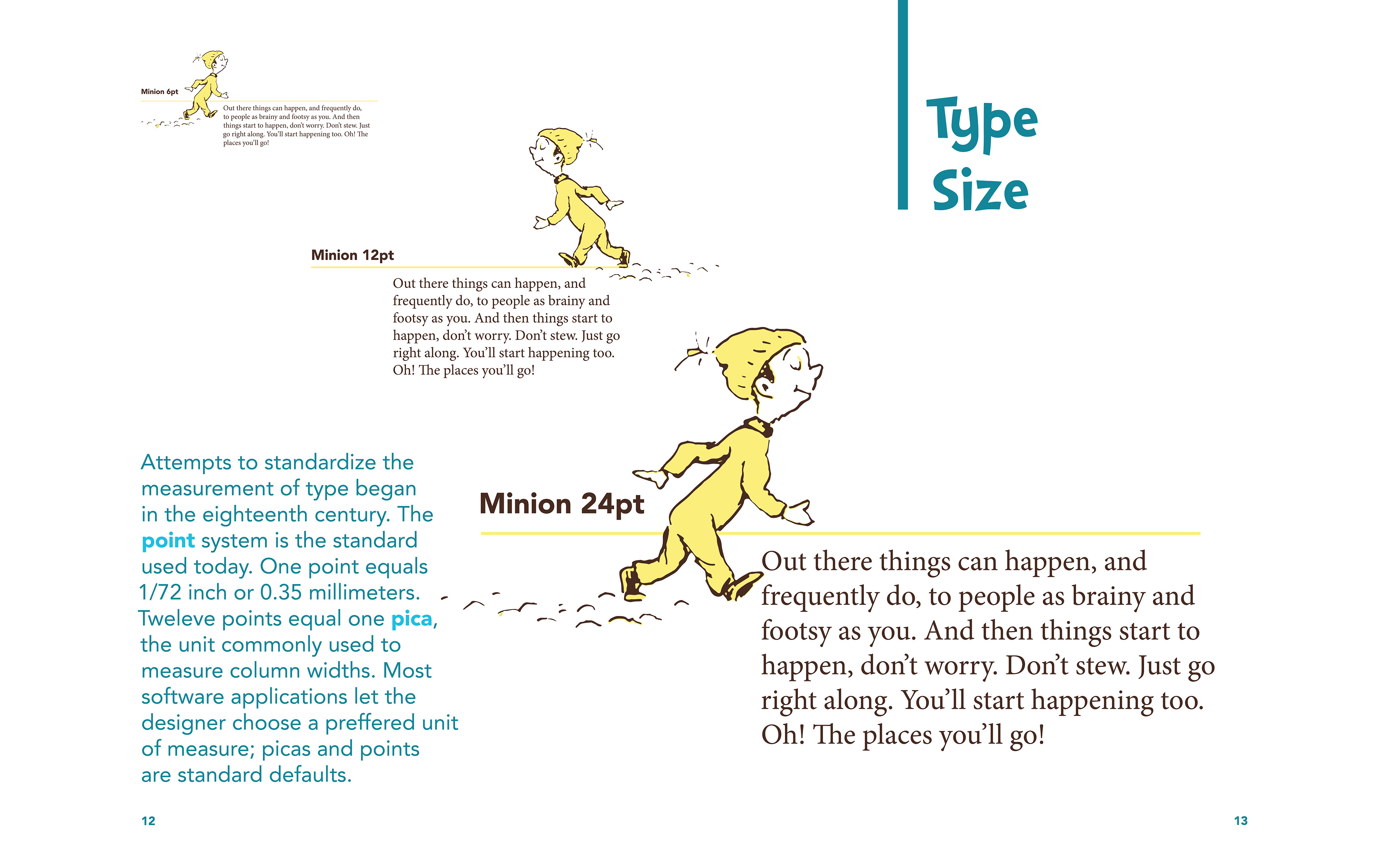 This book provides a straightforward and whimsical explanation of the basics of typography. The theme is based on "Oh, The Places You'll Go" by Dr. Suess.