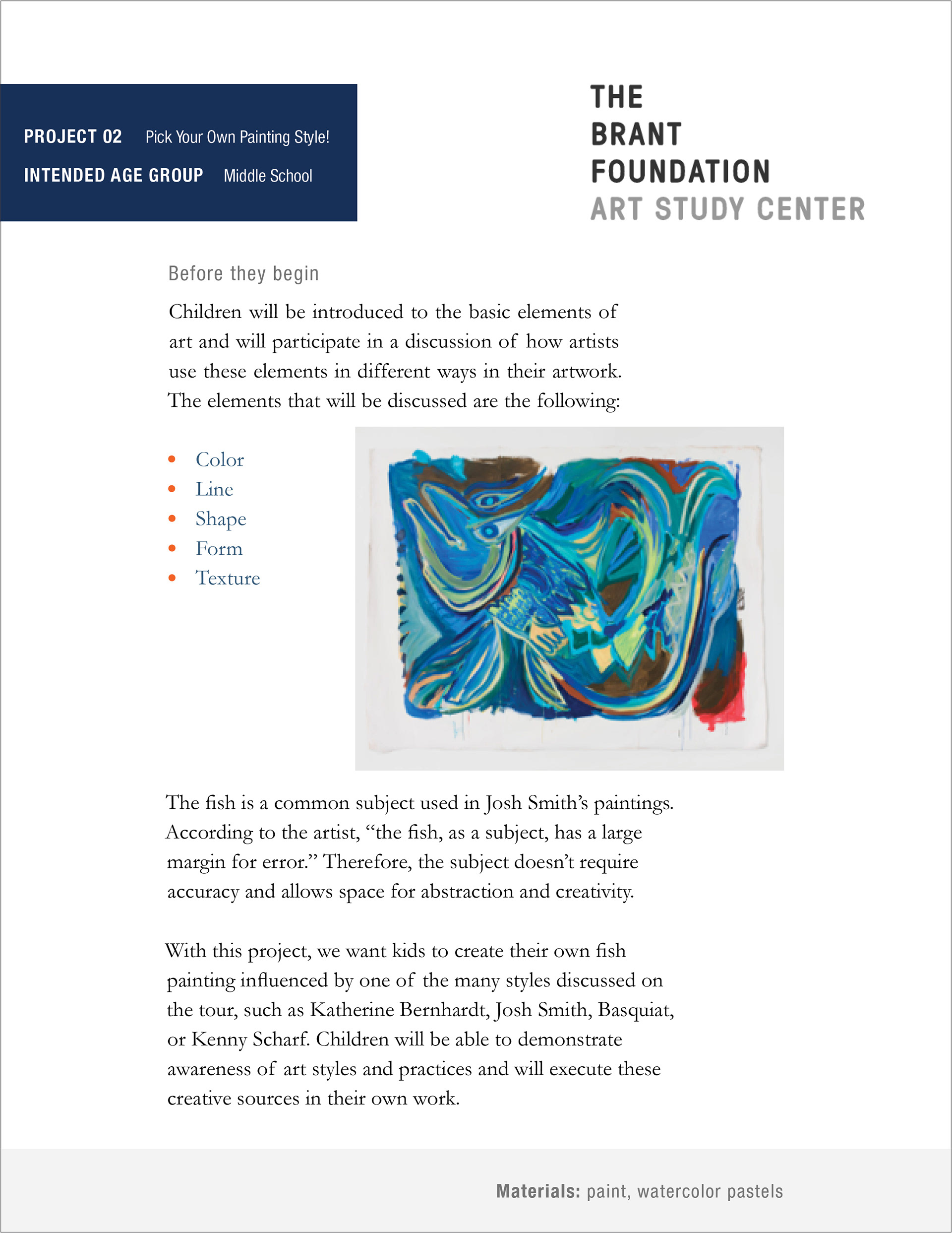 During my time working at The Brant Foundation Art Study Center, I created graphic material for various purposes. My work included social media announcements, project description sheets for educational visits, brochures for upcoming shows, etc.